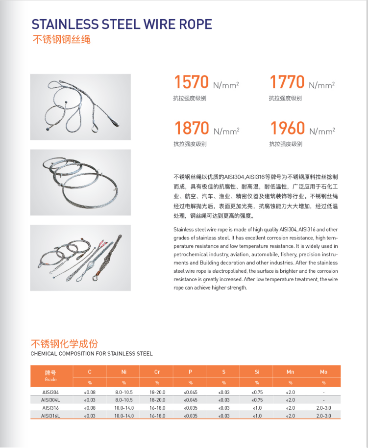Stainless steel wire rope is made of AISI304 or AISI316 material , They have good features for resisting corrosion , heat and low temperature, applied to various fields such as Petrochemical Industries, aircraft , automobile, fishing ,precise instrument, building industry and so on. We can supply all grades Stainless steel material according to your requirements.
