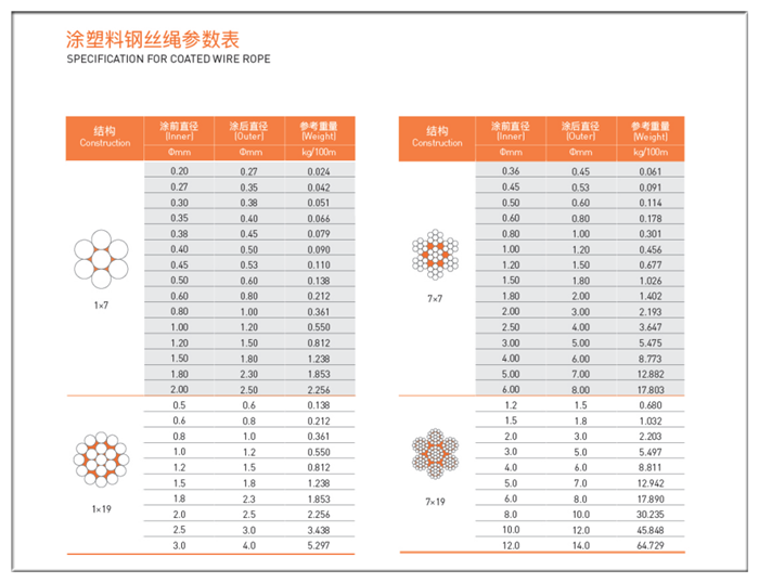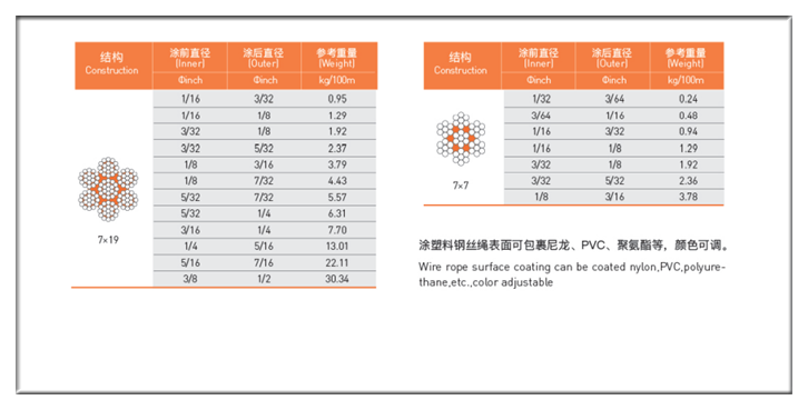 Stainless steel wire rope, small size galvanized rope, fishing gear rope, PVC or nylon plastic coated rope, stainless steel wire rope rigging, etc. 7×7, 7×19, 7×37; Main material: 304, 316, 302, etc. Diameter: ¢0.15mm~¢50mm. The standard stainless steel wire rope is complete, and it can also be customized according to customer requirements.