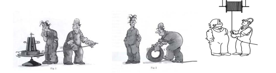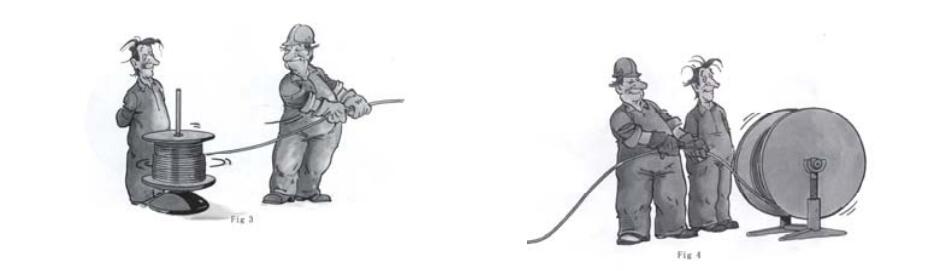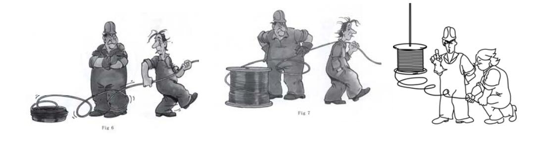 Under no circumstances must the rope be pulled off a coil while it is lying on the ground or looped over the head of the reel, because this procedure will inevitably induce one torsion per wrap into the rope.