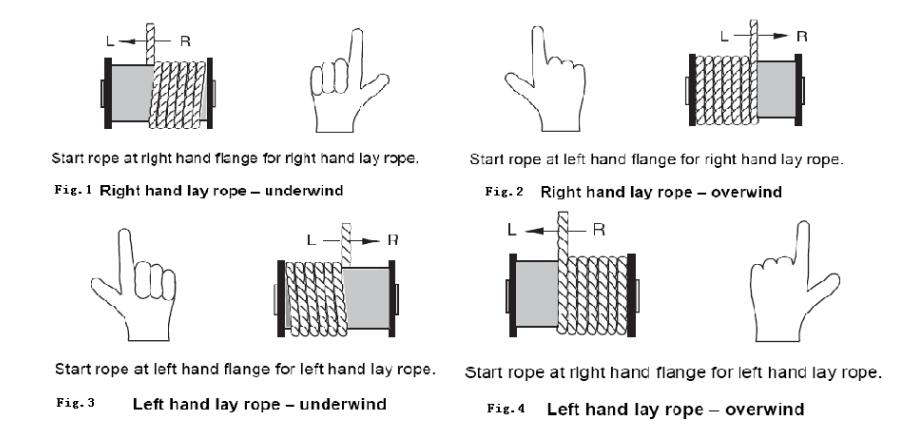 Make certain that the rope bends in the same direction when it is wound from the reel onto the drum, always from top to top or from bottom to bottom. If this procedure is not strictly followed, the rope will either try to twist between reel and drum or it will later try to regain its preferred position when in practical service. In both case structural changes of the rope may occur.