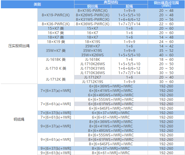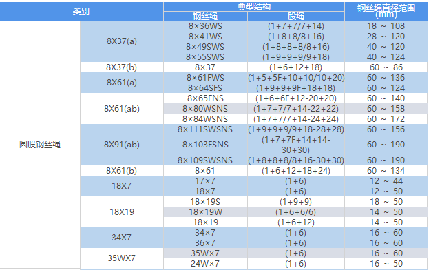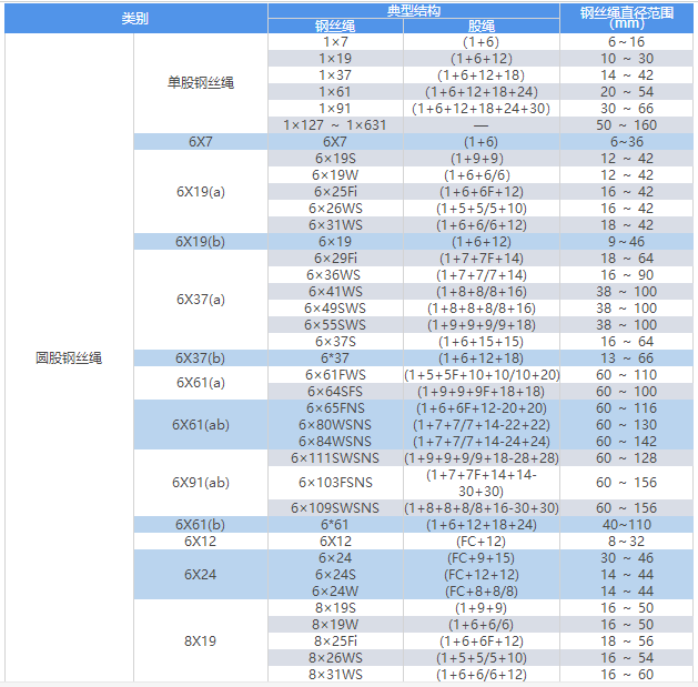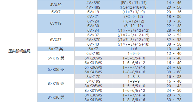 按照鋼絲繩中相鄰層鋼絲的接觸狀態(tài)分:點(diǎn)接觸鋼絲繩、線接觸鋼絲繩、壓實(shí)股鋼絲繩(面接觸鋼絲繩)。 按鋼絲繩股斷面形狀分:圓股鋼絲繩和異型股鋼絲繩。 按制繩用鋼絲表面狀態(tài)分:無(wú)鍍層(光面)鋼絲繩、鍍鋅鋼絲繩、鍍鋅合金鋼絲繩。
