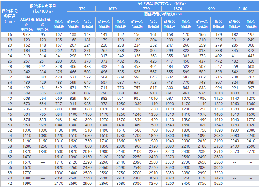 繩結構: 6×25Fi+FC  6×25Fi+IWR   6×26WS+FC   6×26WS+IWR  6×29Fi+FC 6×29Fi+IWR  6×31WS+FC  6×31WS+IWR  6×36WS+FC  6×36WS+IWR 6×37S+FC   6×37S+IW R  6×41WS+FC  6×41WS+IWR  6×49SWS+FC   6×49SWS+IWR  6×55SWS+FC  6×55SWS+IWR