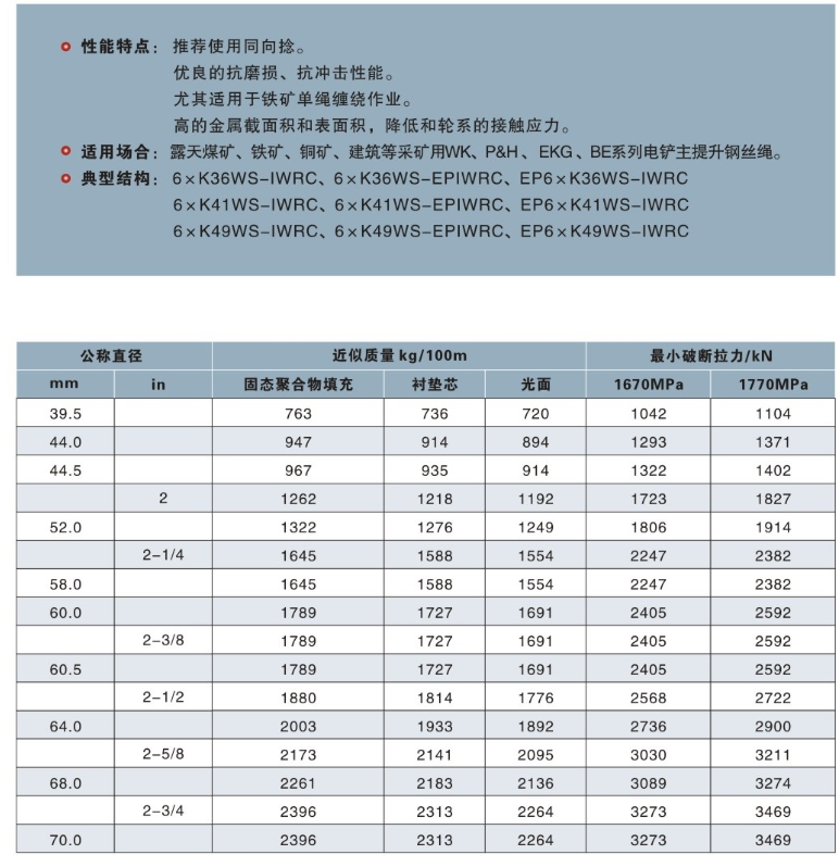 耐磨性好 鋼絲繩芯注塑(IWRC)防止彎曲疲勞和芯降解